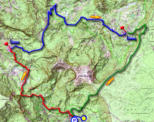 Symbolique et classique, cette agréable boucle fait une incursion dans les trois cirques en trois étapes équilibrées en longueur et difficulté suivant au plus près le GRR1. On peut partir de Cilaos ou de Hell Bourg et en changer le sens. On peut également couper à travers le cirque de Salazie pour éviter la trop longue portion du GR passant par le Bélier. Le circuit de 59 km en quelques chiffres Première étape : 16.6 Km - D+ 1350 m - de 8 à 9 heures de marche Deuxième étape : 22.3 Km - D+ 950 m - de 8 à 9 heures Troisième étape : 20.5 Km - D+ 1850 m - de 9 à 10 heures Premier jour : Quitter Cilaos par le sentier des Porteurs, facile à repérer en ville. Rejoindre les Thermes, poursuivre sur un court tronçon de route avant d'emprunter le sentier de la Cascade du Bras Rouge. La balade est agréable jusqu'à la cascade et devient plus difficile après le passage du gué. Une montée assez raide amène à la route de l'Îlet à Cordes avec quelques raidillons préparant bien l'échauffement pour la montée au Taïbit. Traverser la route de l'îlet à Cordes. Entamer ensuite la longue montée vers le Col du Taïbit par de nombreuses marches. Le sentier est large et toujours en bon état. Deux portions plates permettent de souffler un peu à l'Îlet des Salazes et à la Plaine aux Fraises. L'arrivée au Col du Taïbit ne signe pas encore la fin des montées. Profiter des points de vue sur les deux cirques avant d'entreprendre la descente vers Marla. Le sentier est plus étroit et comporte une portion rocheuse un peu vertigineuse. Le vaste îlet de Marla se traverse sans difficulté. Des haltes sont possibles pour se restaurer ou se reposer. Marcher vers Maison Laclos et bifurquer à gauche avant la Ravine Kelval en direction de la Nouvelle. Il est possible de poursuivre vers la passerelle par un autre sentier pour éviter le gué. On se retrouve de toute façon sur le sentier commun un peu plus haut. Deux sentiers aux alentours de la Ravine Alidor permettent de se rapprocher de la Nouvelle. Quelques raidillons courts amènent avec un dernier effort au plus grand îlet de Mafate pour la nuit. Le lendemain, prendre la direction du Col des Bœufs par une première montée assez forte par endroits jusqu'à la Plaine des Tamarins. Il est possible de rallonger un peu mais de monter plus calmement en empruntant le Chemin Charrette qui sillonne entre les cryptomerias. La plaine, recouverte de magnifiques tamarins incite à marcher plus lentement pour profiter de ces beaux arbres endémiques. Quitter les grands arbres et bifurquer à droite au premier sentier grimpant sur les cailloux vers le Col de Fourche. Certaines portions sont raides mais l'ascension s'effectue assez rapidement. Profiter à nouveau de beaux points de vue sur Mafate et le Cirque de Salazie avant d'entreprendre la descente. La pente est réellement abrupte sur des escaliers bétonnés aux hautes marches. Après la forte pente qui traverse plus bas une belle forêt de cryptomerias, suivre le GRR1 sur une portion moussue assez facile et en faible pente. Traverser la piste forestière et poursuivre jusqu'au pied du Piton Marmite. Après quelques détours en lacets, on se retrouve sur la route du Bélier, à la fin d'un lacet. Entamer la descente, mois agréable dans les longoses qui bordent la petite route et tourner à droite pour pénétrer dans le village. Rejoindre la chapelle abandonnée et débuter la descente du GRR1 en direction de Camp Pierrot et Grand Sable en traversant les plantations sauvages de chouchous. Le GR monte et descend sans cesse au gré du relief ou des petites ravines à franchir. Les filaos deviennent de plus en plus nombreux et la marche peut s'avérer glissante sur les tapis d'aiguilles. Après une descente, le sentier longe des cultures de Camp Pierrot puis se transforme en une large piste. Reprendre le sentier à la fin de la piste et rejoindre la Rivière des Fleurs jaunes par de nouveaux lacets glissants. Traverser à gué et poursuivre jusqu'au gué de la Ravine Grand Sable. Après une montée assez raide mais courte, une longue ligne droite traverse la grande forêt de filaos de Grand Sable, passe devant l'abri de l'ONF et remonte en direction de la Mare d'Affouches. Le sentier se transforme rapidement en piste et la descente est de tout repos jusqu'à la Rivière du Mât. Franchir la rivière par une haute passerelle métallique et remonter quelques lacets jusqu'à la fin de la route de Bras Marron. La fin du parcours emploie une longue portion goudronnée ou bétonnée jusqu'à Hell Bourg. Ne pas manquer, après avoir traversé l'Îlet à Vidot, le sentier partant sur la gauche pour traverser le Bras Sec puis les anciens thermes avant l'ultime montée vers le village pour trouver un gîte dans le village. Le troisième jour, quitter Hell Bourg par la mairie et remonter vers le gîte de Bélouve en débutant sous les filaos, dans les chouchous ou près de gros bambous. Les marches cimentées et empierrées sont très nombreuses faisant de cette montée une agréable manière de remonter un rempart. Quelques parties vertigineuses comportent rambardes et câbles de maintien. Plus haut, on utilise longuement un escalier en béton avant de parvenir à la Ravine de la Vierge. Une dernière montée sur marches amène aux premières cases du gîte, à deux pas du belvédère. Traverser ensuite les installations du gîte et partir sur la piste qui longe le circuit pour handicapés. Elle est presque plate et agréablement bordée par la forêt. Elle se finit à un autre belvédère et un pylône. Le sentier traversant la forêt primaire débute ici, boueux dès le départ. La forêt, en revanche est très belle. On longe des fougères, sabres, de gros troncs de tamarins souvent tortueux dans les branches desquels les rayons du soleil matinal créent de magnifiques couleurs. Les marches sont très hautes et les premières courtes descentes débutent pour franchir les multiples ravines du pa