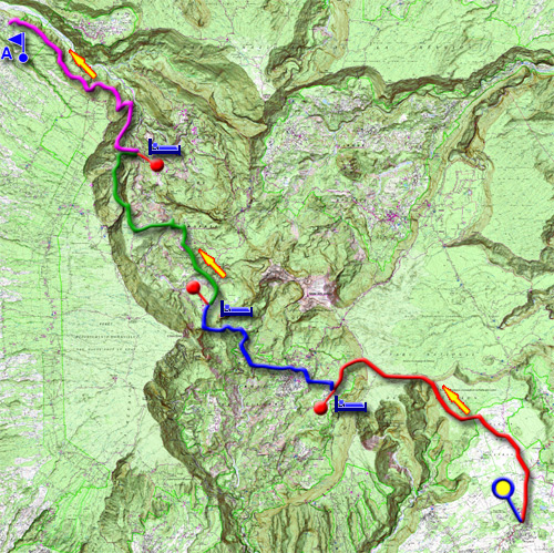 Une agréable traversée de deux cirques à la portée de presque tous où la seule difficulté sera le passage du Col du Taïbit. Le circuit de 67.5 km en quelques chiffres Première étape : 18.5 Km - D+ 700 m - de 6 à 7 heures de marche Deuxième étape : 15 Km - D+ 1300 m - de 6 à 7 heures Troisième étape : 18.5 Km - D+ 800 m - de 5 à 6 heures Quatrième étape : 15.5 Km - D+ 250 m - de 4 à 5 heures Premier jour : Stationner, se faire déposer ou prendre le bus jusqu'à la Plaine des Cafres ou mieux, au départ du sentier du Piton des Neiges. Rejoindre le point IGN 1603 au croisement de la RN3 et de la petite route de la Mare à Boue. Marcher sur route jusqu'au Chemin Doret et la Mare à Boue où se reflète le Piton des Neiges. Poursuivre tout droit sur une récente route bétonnée. Partir à gauche sur le GRR2 et marcher entre les barbelés clôturant les prairies. Effectuer un angle droit vers l'ouest pour contourner le Piton Tortue. Le sentier, agréable jusque là devient de plus en plus boueux. Il se rapproche de la vallée profonde du Bras de Ste Suzanne et plus loin du rempart de Duvernay. Il faut marcher entre les deux remparts avec quelques passages par échelles. Descendre dans une forêt touffue jusqu'aux cavernes du Bras Chansons. La végétation s'amenuise avant d'arriver au Plateau Kerveguen où l'on arrive bientôt à quelques mares de cette zone marécageuse. Continuer sur le sentier du Piton des Neiges à travers les branles verts sur un sentier humide. Partir sur la gauche et entamer la descente de 750 m qui sépare de la route de Bras Sec. On arrête très vite de compter les lacets courts et abrupts dans la forêt de bois de couleurs qui recouvre le rempart. Plus bas, une piste herbeuse ramène à la D241. Les gîtes sont rares à Bras Sec, aussi est il souvent plus pratique de continuer vers Cilaos. Le lendemain, rejoindre Cilaos par le sentier qui franchit le Bras de Benjoin par quelques lacets et finit près de l'hôpital. Filer tout droit et trouver le sentier des porteurs, facile à repérer en ville. Rejoindre les Thermes, poursuivre sur un court tronçon de route avant d'emprunter le sentier de la Cascade du Bras Rouge. La balade est agréable jusqu'à la cascade et devient plus difficile après le passage du gué. Une montée assez raide amène à la route de l'Îlet à Cordes. Entamer ensuite la longue montée vers le Col du Taïbit par de nombreuses marches. Le sentier est large et toujours en bon état. Deux portions plates permettent de souffler un peu à l'Îlet des Salazes et à la Plaine aux Fraises. Profiter des points de vue sur les deux cirques avant d'entreprendre la descente vers Marla. Le sentier est plus étroit et comporte une portion rocheuse un peu vertigineuse. Le vaste îlet de Marla comporte plusieurs gîtes pour la deuxième nuit. Le troisième jour, marcher vers Maison Laclos et bifurquer à gauche avant la Ravine Kelval en direction de la Nouvelle. Il est possible de poursuivre vers la passerelle pour éviter le gué. On se retrouve de toute façon sur le sentier commun un peu plus haut. Deux sentiers aux alentours de la Ravine Alidor permettent de se rapprocher de la Nouvelle. Quelques raidillons courts amènent avec un dernier effort au plus grand îlet de Mafate. Filer plein nord en direction du difficile sentier, tout en lacets vertigineux et glissants, qui permet de retrouver la Rivière des Galets qu'on traverse à gué cette fois après cette impressionnante descente. Une halte est toujours bienvenue ici pour se mouiller un peu et reprendre des forces avant d'entamer une nième grimpée pour passer le Bronchard. Escaliers en pierre, lacets, parties sableuses, rambardes sont nécessaires pour atteindre le col 450 m plus haut. Attaquer le sentier de Roche Plate et rejoindre en pente douce l'escalier bétonné de la Brèche. Une fois à la Brèche, on profite de nouveaux panoramas sur le sud du cirque. Entamer les lacets suivants vers la Ravine Grand Mère. La pente est beaucoup moins forte le long du ruisseau le plus souvent à sec. Après le gué sur la Ravine du Maïdo, entamer une montée en lacets vers les Orangers. Entamer la descente caillouteuse en longeant un affluent puis la Ravine des Orangers jusqu'au captage des Orangers. Partir à droite pour un court trajet en descente protégée de rambardes vers l'îlet des Lataniers pour une troisième nuit de repos. Le quatrième jour, remonter par le même sentier jusqu'au captage des Orangers. Partir à droite par quelques escaliers et entamer une longue étape en longeant au plus près la canalisation des Orangers qui effectue de longs détours pour rester au plus près de la courbe de niveau. On bénéficie de moins de beaux panoramas en marchant dans cette direction mais il suffit de tourner la tête pour s'en régaler. L'itinéraire est à plat et se termine par une longue descente sur piste ou raccourcis en direction de Sans Souci.