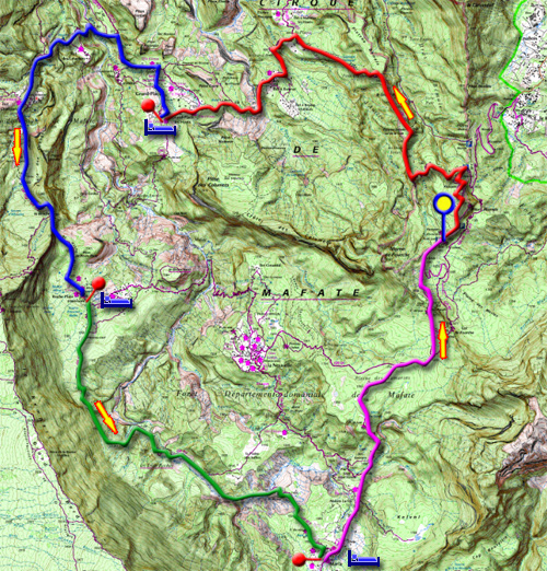 Cette boucle ressemble à une autre présentée dans le même sens mais en trois jours. Comme elle ne fait qu'une quarantaine de kilomètres, elle s'adresse donc à tout public pour connaître le Cirque de Mafate sans affaiblir sa santé. En cas de manque d'entraînement, il suffit de prendre son temps pour être certain d'arriver au gîte dans des délais raisonnables. Le circuit de 39 km en quelques chiffres Première étape : 12.5 Km - D+ 300 m - de 4 à 5 heures de marche Deuxième étape : 10.5 Km - D+ 1200 m - de 5 à 6 heures Troisième étape : 8 Km - D+ 900 m - de 4 à 5 heures Quatrième étape : 8.5 Km - D+ 600 m - de 3 à 4 heures Premier jour : Rejoindre Grand Îlet et remonter au parking du Piton Marmite. Reprendre la route en lacets en direction du Bélier. Après quelques lacets, on arrive au départ du Sentier Scout. Le sentier Scout, sur la gauche, est un grand classique qui débute par de longs détours pour éviter des ravines et se poursuit par une forte montée en escaliers pour atteindre Deux Fesses. Les sujets au vertige, n'aiment en général pas trop ce passage pourtant facile et sans danger. Des câbles fixés à la paroi sécurisent les plus inquiets. La montée est très courte jusqu'au plateau de Sales avant d'entamer la véritable descente vers l'Îlet à Malheur. La marche est facile jusqu'aux filaos du Plateau Bémale. Puis la descente devient de plus en plus raide avec de très hautes marches parfois et de très nombreux lacets. Les points de vue sont fréquents sur le Piton Cabris qui domine au centre du panorama. Les difficultés cessent à l'ancien captage Grimaud reconnaissable à la cuve en ciment qui borde le parcours. Les filaos sont de plus en plus nombreux le long de la descente sur un sol le plus souvent recouvert d'aiguilles sèches, donc glissant. On frôle les premières cases et jardin, on franchit une ravine puis on marche jusqu'au premier croisement. Cette étape étant déjà longue, se rapprocher d'un gîte de l'Îlet à Malheur. Partir à gauche vers l'Îlet à Bourse en effectuant une bonne descente en lacets jusqu'à la Grande Ravine qu'on franchit sur une passerelle. La montée est du même acabit jusqu'à une nouvelle forêt de filaos qui va jusqu'à l'îlet. Une halte est possible près de l'école et du dispensaire avant de reprendre la direction de Grand Place par une nouvelle descente vers le Bras d'Oussy. Si la descente est abordable, la remontée est très raide par endroits. Après l'oratoire marquant la fin de l'ascension, partir sur la gauche pour rejoindre Grand Place les Hauts pour la nuit. Le lendemain, entreprendre la descente et marcher en direction du Piton Papangue qui domine l'école. Partir sur la gauche en arrivant à l'école et marcher en direction de Cayenne sur un sentier en escalier très caillouteux. Eviter la Ravine Fontaine et Cayenne pour descendre à la passerelle de la Rivière des Galets. Entamer une montée assez raide pour atteindre les Lataniers qu'on laisse sur la gauche pour poursuivre sur un sentier escarpé et protégé par endroits jusqu'au captage des Orangers. Le sentier longe la ravine des Orangers et grimpe assez fortement par endroits en direction des Orangers. Il y a possibilité de s'arrêter à l'épicerie sinon continuer en direction de la Brèche avec la dernière forte montée après avoir suivi la Ravine Grand Mère. Une fois à la Brèche, profiter de nouveaux panoramas sur le sud du cirque et entamer la descente vers Roche Plate. La marche est agréable sous les filaos qui envahissent le Piton de Roche Plate. Un petit cours d'eau se passe facilement avant d'arriver aux premières cases de Roche Plate. On a tout le temps de visiter l'îlet avant de s'installer dans un gîte. Le troisième jour, attaquer directement par une montée en lacets vers le Plateau Cerf puis longer sur une grande distance le bas du rempart de Mafate qui domine par ses 1000 m de hauteur. Il faudra passer plusieurs dents de scie et de nombreux changements de direction sur un sol assez pauvre avant de parvenir à la très connue Cascade de Trois Roches pour une pause agréable. Le précipice est assez dangereux et il faut se méfier en tentant de regarder le fond. Repérer les roches en équilibre sur les plaques de basalte qui ont donné leur nom au lieu. Suivre ensuite le sentier presque plat en rive droite de la Rivière des Galets. Laisser la difficile montée à la Plaine aux sables et continuer de longer le cours d'eau. Dans un coude, emprunter un escalier sur la gauche et contourner le rein pour retrouver un peu plus loin la rivière qu'on franchit à gué sur de gros galets parfois instables. Une difficile montée débute sur un sol très rocailleux et instable. Heureusement, de belles marches ont été aménagées dans quelques cailloutis qui nécessitent un peu d'attention pour ne pas déraper ou trébucher sur des pierres branlantes. Les filaos, plus nombreux, retiennent mieux le terrain et la pente s'assagit à l'approche de Marla où comme la veille, on peut flâner dans l'îlet avant de s'installer. Le quatrième jour, quitter Marla par le nord et marcher en direction de Maison Laclos puis de la Plaine des Tamarins en délaissant à gauche les divers sentiers de la Nouvelle. Un premier gué sur le Bras Massine est suivi rapidement d'un deuxième sur la Rivière des Galets. Une forte pente sableuse et rocailleuse suit en lacets jusqu'au point de vue sur Marla depuis la Plaine des Tamarins. Le sol est presque plat dans des prairies pleines de joncs ou paissent quelques petits troupeaux aux alentours de la Mare des Serres qui s'assèche doucement. Les tamarins sont partout, debout, couchés ou morts et la jonction avec le sentier de la Nouvelle est rapide et facile. La traversée de la plaine continue sur des planchers sommaires faits de buches et rondins de tamarins. Puis le sentier commence une montée plus difficile jusqu'au croisement avec le sentier du Col de Fourche. Continuer en direction du
