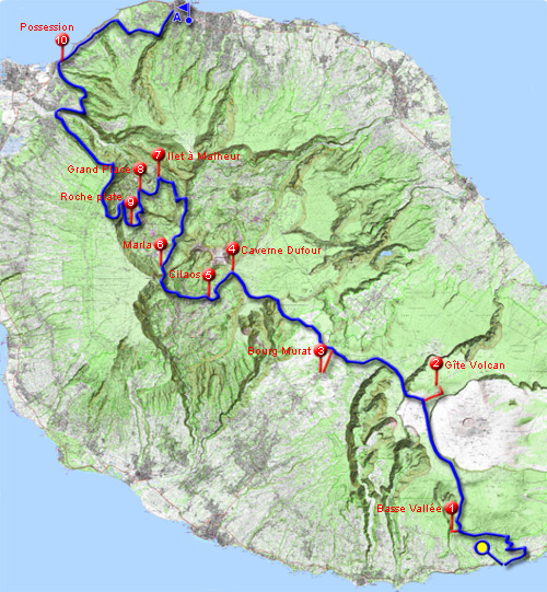 On ne décrit plus le Grand Raid, à juste titre baptisé Diagonale des Fous. Si les meilleurs mettent moins d'un jour pour atteindre l'arrivée, d'autres ont du mal à y parvenir en 3 jours et abandonnent en chemin devant la difficulté de l'épreuve. Effectuée en 6 jours sans esprit de compétition, cette longue épreuve est faisable mais demande une très bonne organisation car les hébergements ne sont pas régulièrement répartis le long du parcours. Inutile de préciser qu'il faut, même en 6 jours, un sérieux entraînement et que cette aventure ne s'adresse qu'à des marcheurs confirmés et motivés. Il faut en plus prévoir une intendance particulière pour changer de vêtements et trouver les ravitaillements indispensables. L'astuce consiste donc à marcher léger et bien équipé et de donner des points de rendez-vous à une personne chargée de minimiser les difficultés en apportant du linge propre et la nourriture indispensable dans la journée ; cette option étant offerte le soir au gîte. Le circuit a changé et part désormais de Saint-Pierre en traversant de nombreuses propriétés privées, aimablement prêtées pour l'occasion. Il est donc impossible de reproduire ce circuit sans pénétrer chez autrui. Premier jour : Se rendre à Saint-Philippe et débuter la traversée à quelques mètres de l'église par une première montée par le Chemin de Ceinture qui n'est pas difficile mais comporte des dizaines de lacets qui ont vite fait de rajouter des kilomètres. 250 m plus haut, il part à l'ouest et redescend pour rejoindre le départ du sentier botanique de Mare Longue. Emprunter ce sentier où il vaut mieux prendre au plus court et laisser les cours de botanique pour une autre visite. A la fin du circuit, remonter à 500 mètres par la RF de Mare Longue puis prendre à gauche la route des Camphriers pour une longue traversée, reposante, de la belle forêt de bois de couleurs. Visiter la grotte cachée par les goyaviers puis entamer la montée vers les Puys Ramond. C'est parti pour 1400 mètres de montée avant de rencontrer le premier puy recouvert de cendres. Malgré une pente qui paraît régulière sur la carte, le sentier effectue pourtant d'innombrables petites descentes suivies de légères remontées pour franchir obstacles ou petites ravines qui rajoutent du D+. On domine sans trop la voir la Vallée Heureuse. A 1870 m, on rencontre le Piton Rick qui n'est pas de la même époque que les cratères suivants. De nouveaux cratères se remarquent aux alentours de 2000 m mais on aperçoit déjà les cratères qui dépassent des brandes. La végétation disparaît presque par moments. On passe entre ces hautes cheminées. Il reste encore beaucoup de chemin avant d'arriver au gîte mais il est possible de grimper tous ces petits pitons. Tenter d'en escalader au moins un pour profiter des beaux paysages depuis le sommet. On aperçoit déjà la Fournaise qui dépasse à l'horizon. La végétation est assez rase et le terrain a beaucoup perdu en angle de marche. La fin de la montée est donc beaucoup plus facile jusqu'au Piton de Bert. Se rapprocher du vide pour apprécier le spectacle du Piton de la Fournaise ou de l'Enclos Fouqué strié de noir des dernières éruptions. Entamer une longue remontée le long de la caldeira sur un itinéraire de plus en plus aisé d'autant qu'une piste y a été construite et qu'on pourra bientôt y venir en planche à roulettes. La fin de la montée s'effectue en longeant le Piton Rouge, en frôlant une chapelle faite de plaques de lave et une caverne que peu de monde visite. On est au pied du Piton Chisny et on rencontre très vite la RF du Volcan. Le parcours officiel file vers le Plateau des Basaltes mais il faut bien dormir. Partir donc à droite et marcher jusqu'au gîte du Volcan, à quelques centaines de mètres. Le lendemain, emprunter tout d'abord la route forestière puis le sentier partant sur la droite pour rejoindre la Griffe du Diable. Partir sur le sentier Josémont en direction du Plateau des Basaltes, remonter quelques lacets caillouteux, traverser le plateau et poursuivre, toujours dans les pierres en direction de l'oratoire Ste-Thérèse. Entamer la descente par le sentier ou la vieille piste qui descend vers le Textor. Le sol est basaltique ou rocailleux mais la marche est aisée. On passe près de la Caverne des Lataniers, de la stèle à la gloire de Josémont Lauret puis le sentier coupe plusieurs fois la route avant de parvenir au pied du Piton Textor. Prendre vers le nord au Textor et marcher en direction du Lac Argamasse, souvent à sec. Partir plein ouest en direction du Piton Rouge sur un sentier très boueux qui zigzague constamment dans les branles verts et gris. On frôle le Piton Argamasse, celui des Herbes Blanches, le Piton Misère avant de parvenir au sommet du Piton Rouge. Entamer une longue descente vers le Piton Barolet et obliquer en longeant les pâturages. Obliquer à droite et marcher entre les clôtures vers le Chalet des Pâtres puis terminer le sentier à la petite route qui serpente dans les prairies jusqu'à la RN 3. Là également, le parcours coupe la route et part en direction de Mare à Boue. Rejoindre Bourg Murat pour passer la deuxième nuit. Le troisième jour, reprendre la route en direction de la Plaine des Palmistes et rejoindre le point IGN 1603 au croisement de la RN3 et de la petite route de la Mare à Boue. Marcher sur route jusqu'au Chemin Doret et la Mare à Boue où se reflète le Piton des Neiges. Poursuivre tout droit sur une nouvelle route bétonnée. Partir à gauche sur le GRR2 et marcher entre les barbelés clôturant les prairies. Effectuer un angle droit vers l'ouest pour contourner le Piton Tortue. Le sentier, agréable jusque là devient de plus en plus boueux. Il se rapproche de la vallée profonde du Bras de Ste Suzanne et plus loin de celui de Duvernay. Il faut marcher entre les deux remparts avec quelques passages par échelles. Descendre dans une forê