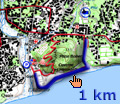 Lecture de la carte : Le trait rouge représente une étape pour laquelle aucune fiche n'est disponible ; en général, de courts transits sur route. Les traits verts et bleus montrent qu'un circuit est proposé sur le site, qu'il a été reconnu et qu'il peut être utilisé sans crainte. Les points jaunes et les lits marquent la fin d'une journée, au plus près d'un lieu d'hébergement