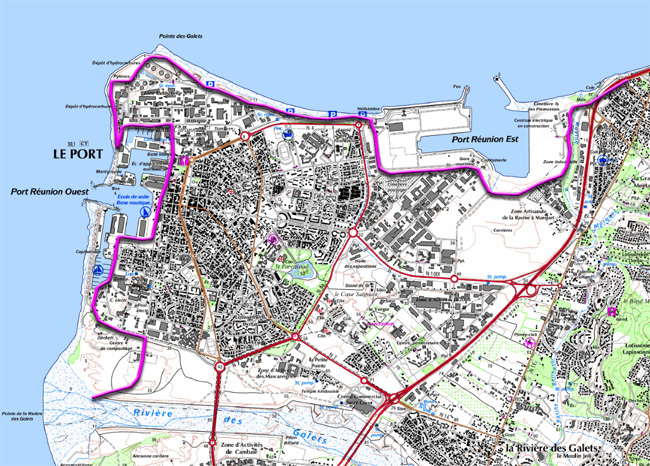 Longue étape urbaine qui débute à la Possession par la Rue Raymond Mondon à la fin du Chemin des Anglais. Elle longe la voie rapide et se poursuit dans les mêmes conditions par la Rue Waldeck Rocher jusqu'au rond-point du Capitaine Lebourg, début de la route du Port. Prendre une longue portion de la Rue Jesse Owens qui contourne la centrale électrique et le port Est avant de rejoindre l'océan à deux ronds-points. Suivre la plage en marchant à l'ombre des arbres du parc et filer vers les citernes. Les contourner par le nord et rejoindre le port Ouest en longeant les vagues au plus près sur pistes et rues. Contourner le port Ouest et celui de plaisance par l'Avenue du 28 novembre, la Rue de l'Amiral Bosse et emprunter la Rue Rio de Janeiro au rond-point juste au début de l'Avenue de la Marine. Rejoindre la Rivière des Galets qui se passe facilement à gué.