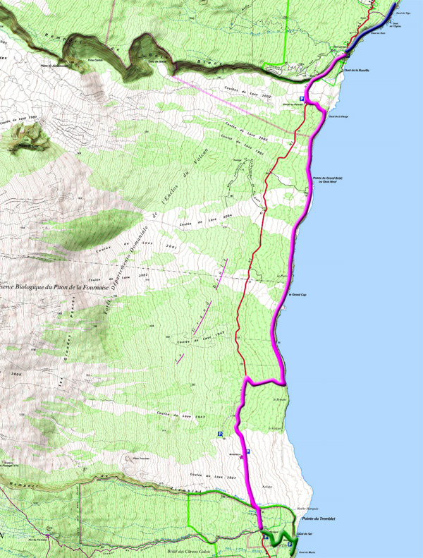 Cette dernière étape du Sud est très agréable et l'on peut, au choix, utiliser le sentier officiel ou celui des pêcheurs pour rejoindre la Pointe du Tremblet à quelques mètres du parking. La traversée du Grand Brulé étant devenue assez aléatoire, il ne faut pas continuer vers la Pointe du Tremblet et la Coulée de 2007 mais remonter la route du Port pour reprendre la RN2 (1,5 km). On utilise la totalité de la fiche.