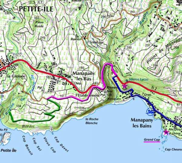 Au virage à gauche du Chemin de la Source, filer tout droit sur le minuscule sentier qui remonte la pente de la falaise vers un élevage de porcs (odeurs) et bifurquer à gauche au premier croisement pour retrouver 300 mètres plus loin les premières maisons et la rue du Puits qui ramène à la RN2. En cas de doute, poursuivre sur le Chemin de la Source jusqu'à la RN (voir carte). Prendre la RN vers Saint-Philippe et marcher jusqu'à la Rue de Terre Rouge.