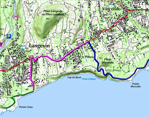 A partir du terrain de sport de la Caverne des Hirondelles, effectuer la moitié du parcours du tour du Piton Babet et rejoindre la RN2 en direction de Langevin. On utilise uniquement la partie de la fiche le long du littoral.